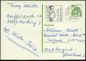 2591 | 6 € | 3550 MARBURG : 3550 MARBURG,LAHN 1/ sc/ Weltgesundheitsthema´84/ Gesundheit unserer Kinder 1985 (11.2.) MWSt mit UB "sc"= Kind mit Teddy-Bär , Bedarfs-Kt. (Bo.S 1378 A, 12 Monate in 11 hess. Orten) | ![]() | |