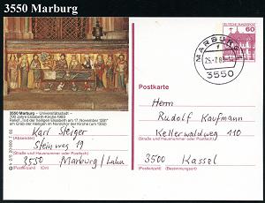 2588 | 15 € | 3550 MARBURG : 3550 MARBURG 1/ f 1983 (25.7.) 1K-Segment auf ortsgleicher 60 Pf. BiP Burgen , lilarot: 700 Jahre Elisabeth-Kirche, Relief "Tod der hl. Elisabeth am 17. Nov.1281".., Inl.-Karte, seltene Kombination! (Mi.P 138) | ![]() | |