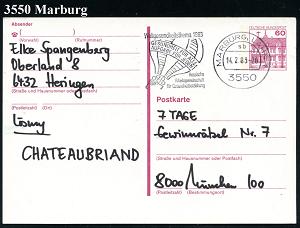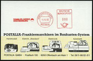 2608 | 18 € | 3550 MARBURG : 3550 Marburg 1983 (9.6.) AFS.: VORFÜHRSTEMPEL/POSTALIA/TEMMLER-WERKE (Logo) seltene Postalia-Musterkt.! (= Specimen) | ![]() | |