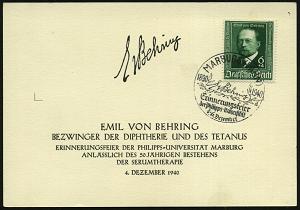 2568 | 18 € | 3550 MARBURG : MARBURG (LAHN)/ E v Behring/ d/ Erinnerungsfeier.. 1940 (4.12.) SSt mit UB "d" (Schriftzug "E v Behring") auf 6 + 4 Pf. Emil von Behring (Mi.760) auf Jubil.-Gedenkblatt mit Faksimile-Signatur (Bo.8 d) | ![]() | |