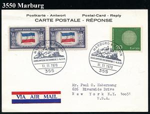 2578 | 18 € | 3550 MARBURG : 355 MARBURG a d LAHN/ JUGOSLAWISCHE KULTURWOCHE.. 1970 (11.11.) SSt (Ortsbild) 2x auf MiF 20 Pf. CEPT-Europa + USA Paar 5 C. Jugoslawien-Flagge , zulässige Übersee-Flp.-Antwort-Kt. in die USA, Unikat ! | ![]() | |