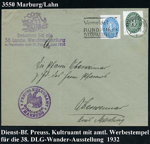2559 | 18 € | 3550 MARBURG : Marburg/ Lahn 1932 (19.2.) Dienst 4 Pf. u. 8 Pf. + viol. Dienst-HdN: PREUSS. KULTURAMT/MARBURG + amtl. HWSt: DLG/ Be-suchen Sie die/38. Landw. Wanderausstellung/in Mannheim..1932 (Bauer m. Ochsen-Pflug) klar gest. Dienstbf. (schwache Falte, rs. Klappenriß) dekorativ u. selten! (Mi.D 116, D 127) | ![]() | |