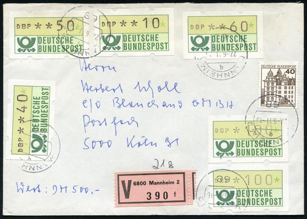 2701 | 18 € | 6800 Mannheim Allgemeine Belege : 68 MANNHEIM 2/ q 1981 (22.6.) 1K-Segment 5x auf.ATM 10, 40, 50, 60 u.2x 100 Pf. + 40 Pf.Bauwerke, rosa V-Zettel: 6800 Mannheim 2/f, Fern-Wert-Bf. 500.- DM n. Köln | ![]() | |