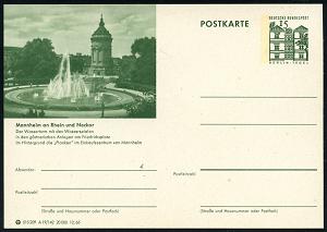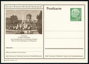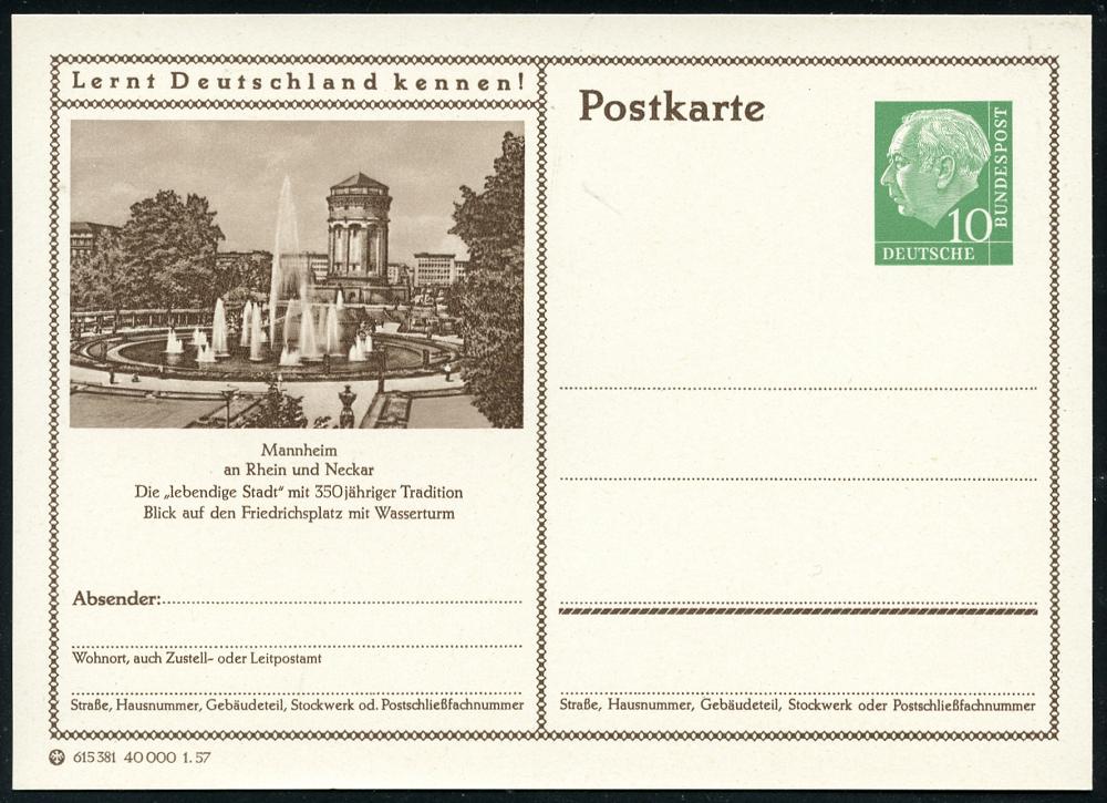 2695 | 6 € | 6800 Mannheim Allgemeine Belege : Mannheim 1957 10 Pf. BiP Heuss I, grün: Friedrichsplatz u. Wasserturm (u. Brunnen) ungebr. (Mi.P 24) | ![]() | |
