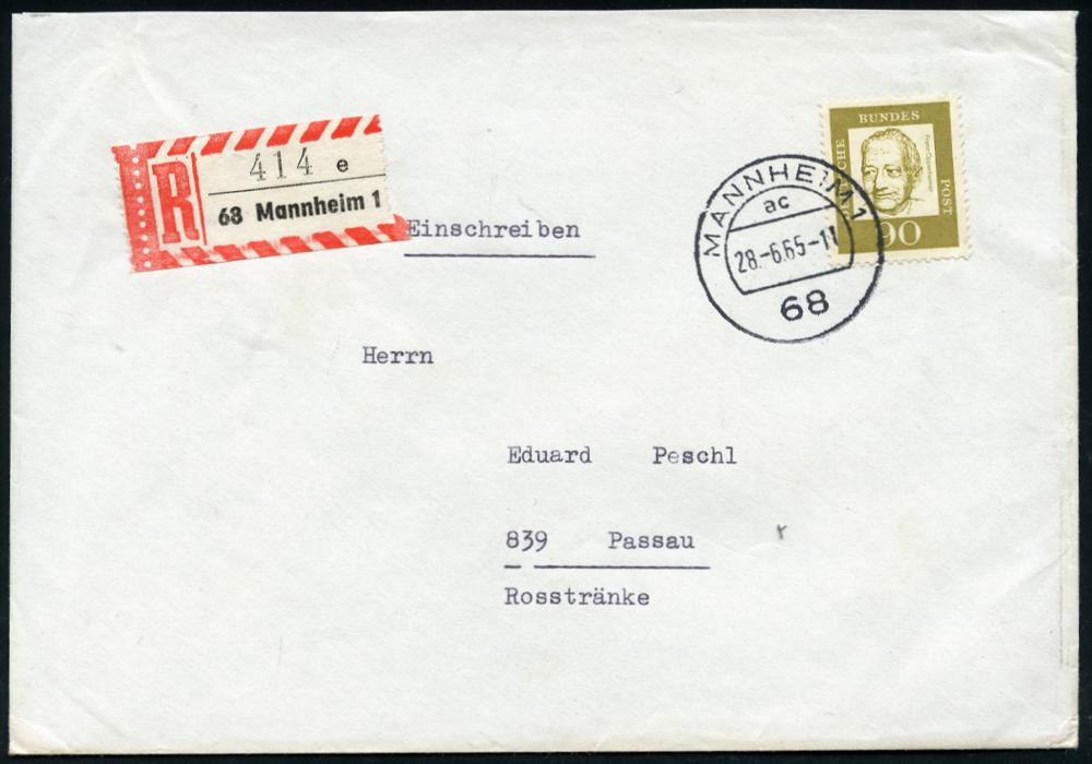2699 | 12 € | 6800 Mannheim Allgemeine Belege : 68 MANNHEIM 1/ ac 1965 (28.6.) 1K-Segment auf EF 90 Pf. F. Oppenheimer (Volkswissenschaftler) + RZ: 68 Mannheim 1/e, klar gest. Fern-R-Bf. (Mi.360 y, EF + 10.- EUR) | ![]() | |