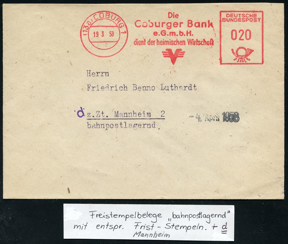 2702 | 15 € | 6800 Mannheim Allgemeine Belege : (13a) COBURG 1/ Die/ Coburger Bank.. 1958 (19.3.) AFS + viol. Datums-1L + Buchstaben-HdN "d" = Bahnpost-Lagerstempel Mannheim 2 (Lagerfrist) Fern-Bf. an Bahnpostamt Mannheim 2 (Dü.E-23CO) | ![]() | |