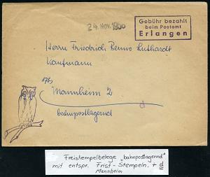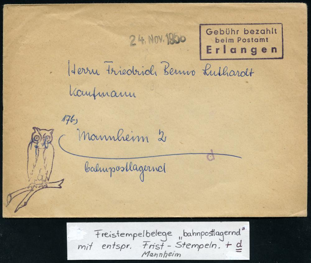 2703 | 15 € | 6800 Mannheim Allgemeine Belege : Erlangen/ Gebühr bezahlt.. 1958 (24.11.) viol. Ra.3 + Eulen-HdN + viol. Datums-1L + Buchstaben-HdN: "d" = Bahnpost-Lagerstempel Mannheim 2 (Lagerfrist) Firmen-Fern-Bf. Fa. Rholl, Erlangen an Bahnpostamt Mannheim 2 | ![]() | |