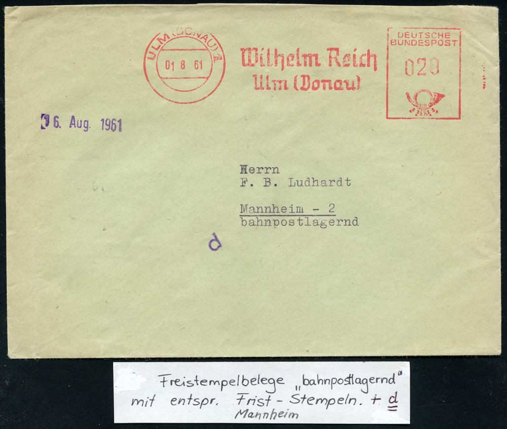 2704 | 15 € | 6800 Mannheim Allgemeine Belege : ULM (DONAU) 1/ Wilhelm Reich 1961 (1.8.) AFS + viol. Datums-1L + Buchstaben-HdN: "d" = Bahnpost-Lagerstempel Mannheim 2 (Lagerfrist) Firmen-Fern-Bf. an Bahnpostamt Mannheim 2 (Dü.E-23CG) | ![]() | |