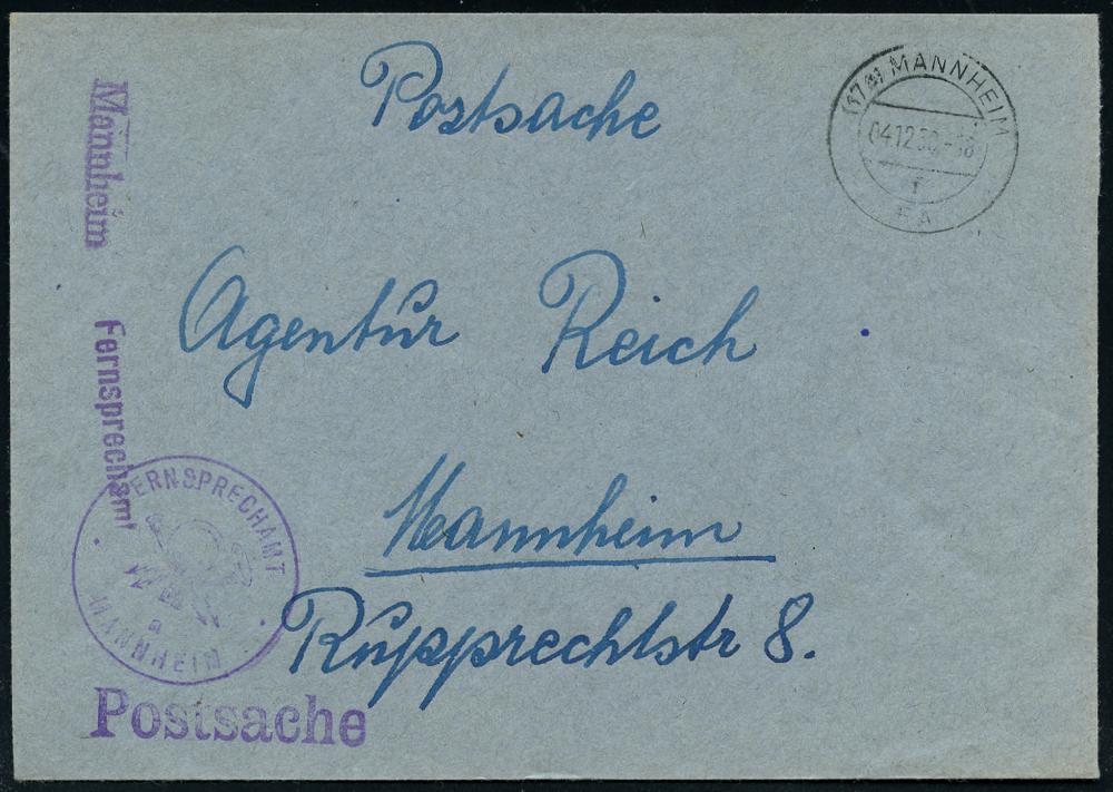 2692 | 15 € | 6800 Mannheim Allgemeine Belege : (17a) MANNHEIM/ F A 1950 (4.12.) 2K-Steg = F(ern) A(mt) + viol. 1L: Mannheim + Fernsprechamt + viol. Dienstsiegel-HdN (Posthorn mit Blitzen) Postdienst-Orts-Bf. | ![]() | |