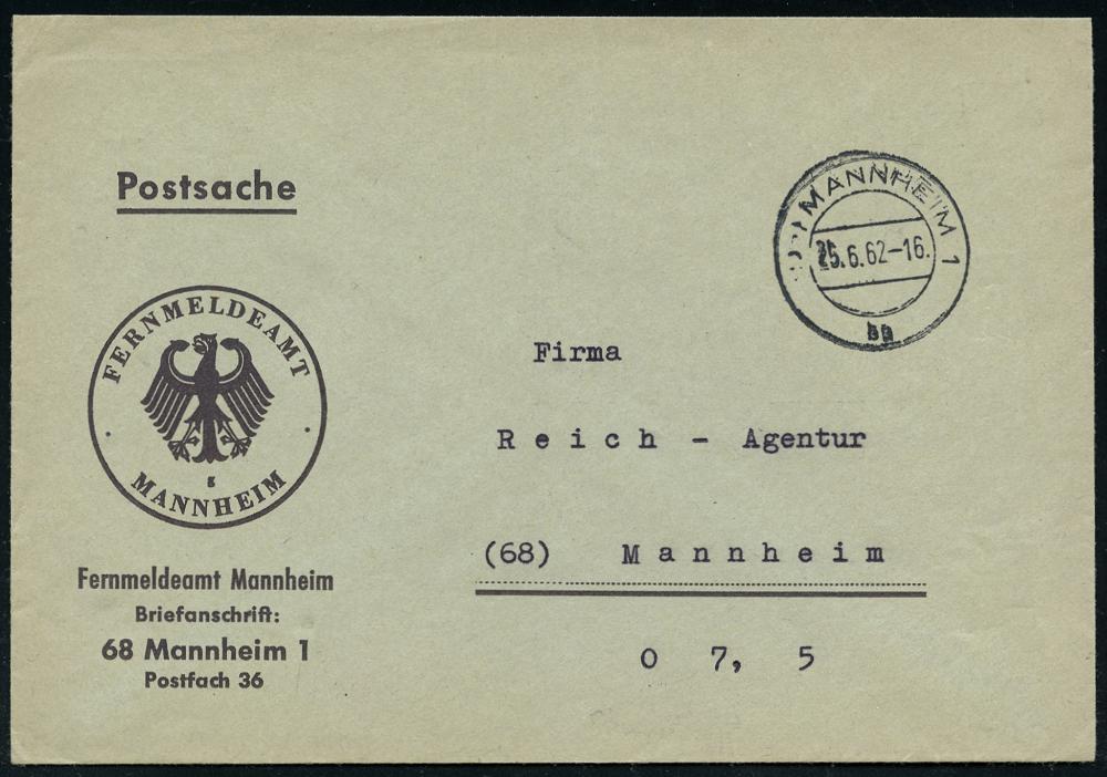 2696 | 12 € | 6800 Mannheim Allgemeine Belege : MANNHEIM 1/ bg 1962 (25.6.) aptierter 2K-Steg = alte PLGZ entfernt auf Dienst-Bf. mit neuer PLZ: 68 Mannheim 1, Fernmeldeamt.. (Adler) Ortsbf. | ![]() | |