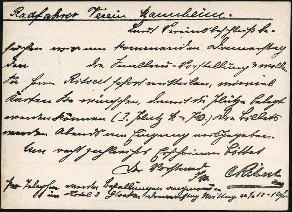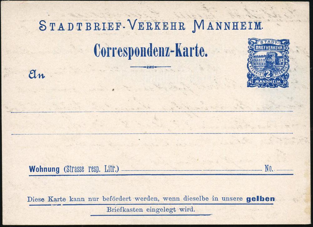 2672 | 35 € | 6800 Mannheim Allgemeine Belege : Mannheim 1896 "Stadt-Briefverkehr Mannheim", Orts-P 2 Pf. Schloß, blau + rs. Zurdruck: Radfahrer Verein Mannheim , ungebr., selten!, früher Thematik-Beleg! | ![]() ![]() | |