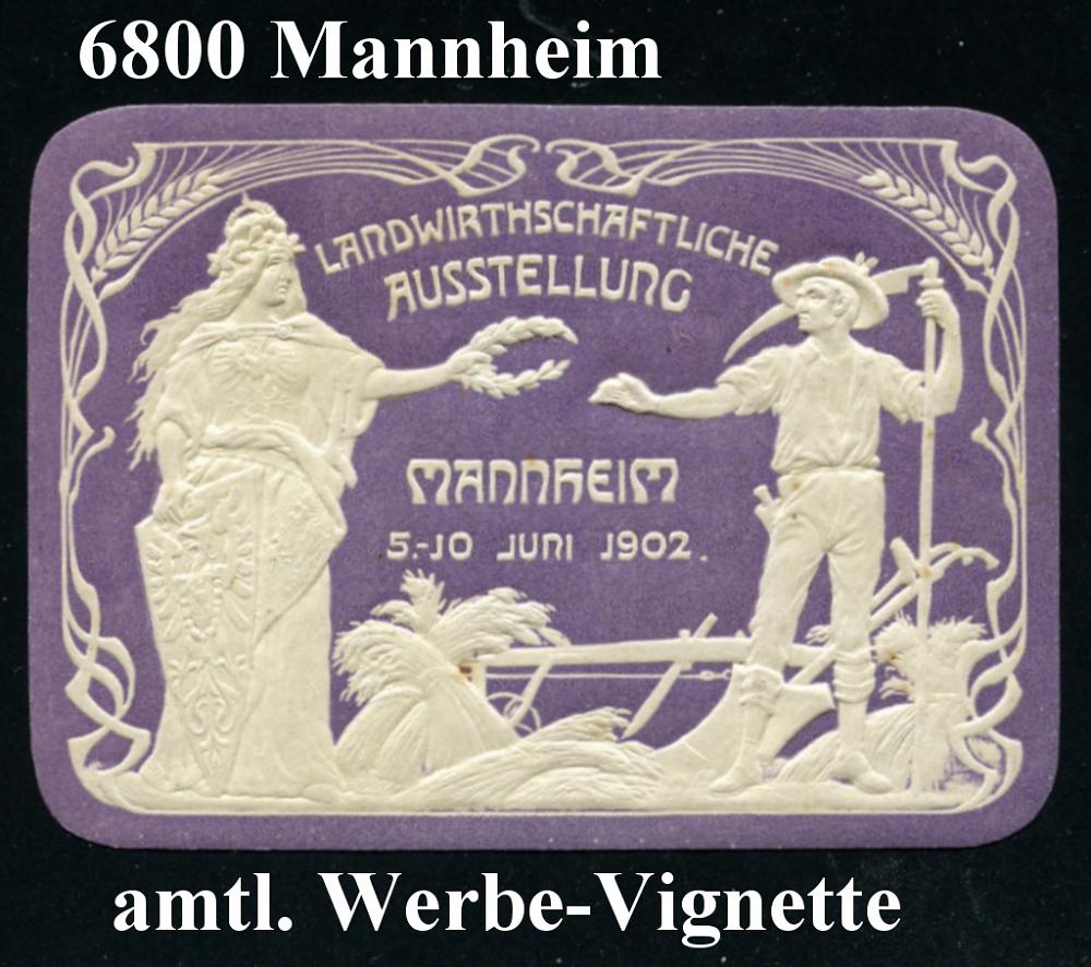 2675 | 12 € | 6800 Mannheim Allgemeine Belege : MANNHEIM/ LANDWIRTHSCHAFTL.AUSSTELLUNG 1902 (Juni) dekorative Präge-Vignette, (Germania, Bauer, Plug etc.) voller orig.G., | ![]() | |