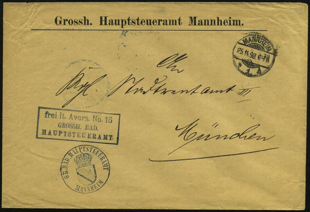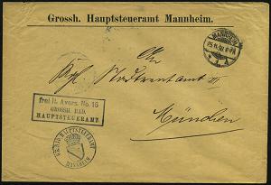 2673 | 18 € | 6800 Mannheim Allgemeine Belege : MANNHEIM/ *1h 1898 (25.11.) 1K-Gitter + viol. Ra.3: frei lt. Avers. No.16/GROSSH. BAD./ HAUPTSTEUERAMT + schw. 1K-HdN (Wappen) Dienst-Bf.: Grossh. Hauptsteueramt.. (kl. Rißchen) Fern-Bf. n. München | ![]() | |