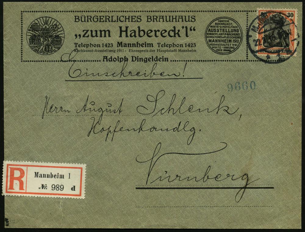 2676 | 20 € | 6800 Mannheim Allgemeine Belege : MANNHEIM/ *1a 1916 (22.3.) 1K-Brücke auf EF 30 Pf. Germania, dekorat. Reklame-Bf.: BÜRGERLICHES BRAUHAUS "zum Habereck´l".. Adolph Dingeldein , rs. viol. Abs.-3L + gez. RZ: Mannheim 1 d, Fern-R-Bf. (unten Riß) an Hopfenhandlung in Nürnberg (Mi.89 II) | ![]() ![]() | |