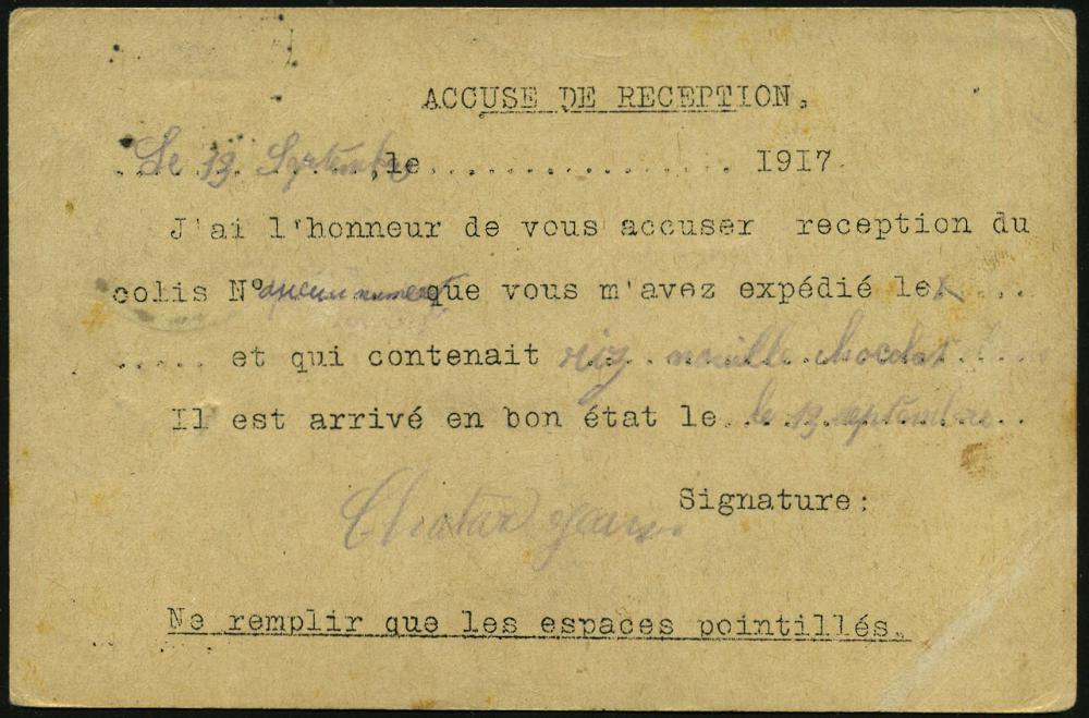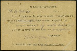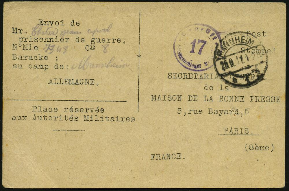 2677 | 16 € | 6800 Mannheim Allgemeine Belege : MANNHEIM/ *1s 1917 (25.9.) 1K-Brücke + viol. Zensur-1K: Geprüft/17/Gefangenenlager Mannheim (Wo.93 d) Kgf.-Vordr.-Paket-Bestätigungs-Karte n. Paris | ![]() ![]() | |