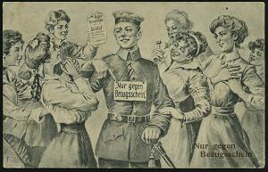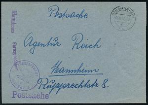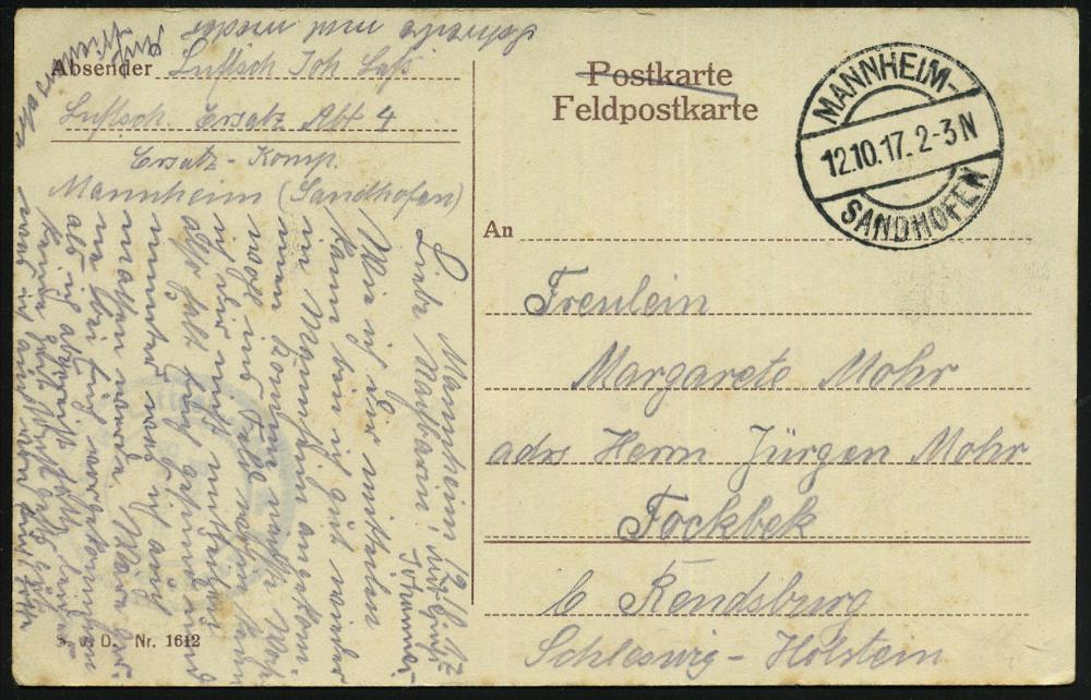 2678 | 30 € | 6800 Mannheim Allgemeine Belege : MANNHEIM-/ SANDHOFEN 1917 (12.10.) 1K-Brücke + hs. Abs.: "Luftsch.(iffer) Luftsch. Ersatz Abt. 4, Ersatz-Komp." , s/w.-Feldpost-Künstler-Ak.: Nur gegen Bezugsschein (von Frauen umschwärmter Soldat) sign. Fr. Ro. n. Fockbek | ![]() ![]() | |