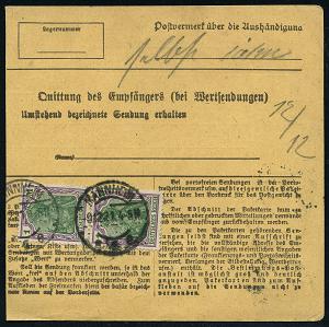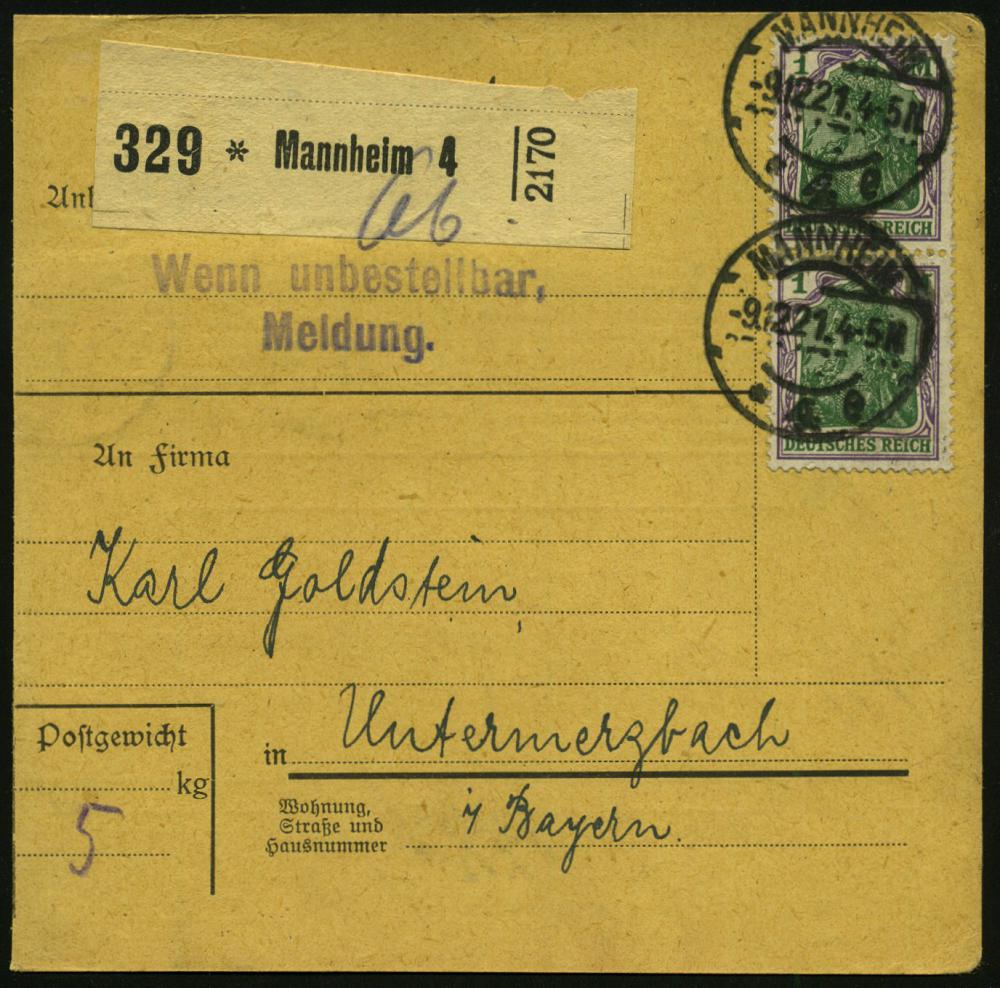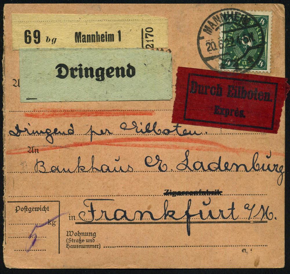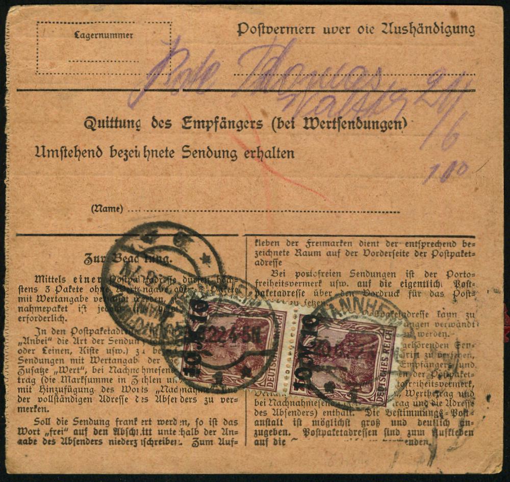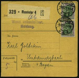 2680 | 20 € | 6800 Mannheim Allgemeine Belege : MANNHEIM/ *1* 1922 (20.6.) 1K-Brücke auf 4 Mk. Posthorn, grün + rs. 2x 10 Mk./75 Pf. Germania , klar gest. Inl.-Eil-Paket-Karte n. Ffm., rs. AS. (Mi.2x 157, 193) | ![]() ![]() | |