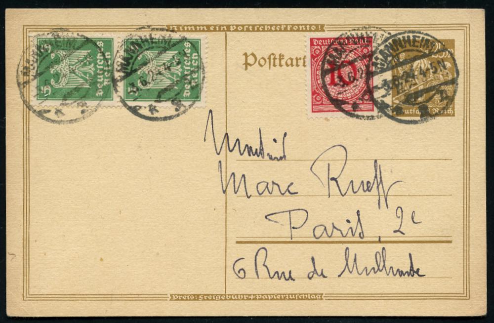 2681 | 16 € | 6800 Mannheim Allgemeine Belege : MANNHEIM/ *2n 1924 (3.6.) 1K-Brücke auf unverausgabter Infla-P. 25 Mk. Landarbeiter als Formblatt + 10 Pf. Korbdeckel + Paar 5 Pf. Adler (Mi.340, 2x 356), Ausl.-Karte n. Paris (Mi.P I) | ![]() | |