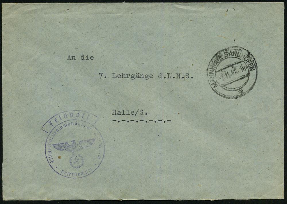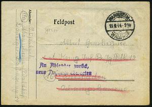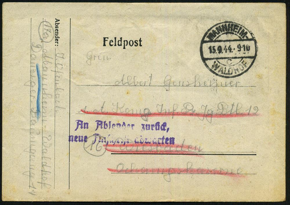 2689 | 16 € | 6800 Mannheim Allgemeine Belege : MANNHEIM-/ c/ WALDHOF 1944 (15.9.) 1K-Brücke + viol. 2L: An Absender zurück,/ neue Anschrift abwarten (Mi.19.2) Feldpost-Retour-Falt-Bf. mit Inhalt an Panzer-Jäger Btl. 12, Wiesbaden | ![]() | |