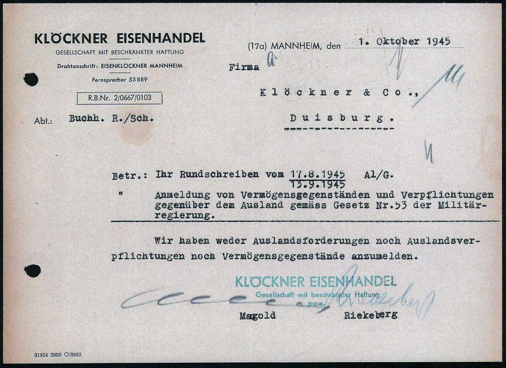 2690 | 25 € | 6800 Mannheim Allgemeine Belege : Mannheim 1945 (1.10.) Briefbogen: KLÖCKNER EISENHANDEL BETR: Rundschreiben vom August 1945 = Vorab-Interzonenpostverkehr! (links gelocht) Text über "Gesetz Nr. 53" der Militärregierung = Anmeldung von Vermögen u. Auslands-Verpflichtungen, interess. Beleg!, ex Slg. A. Meschenmoser! | ![]() | |
