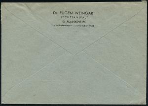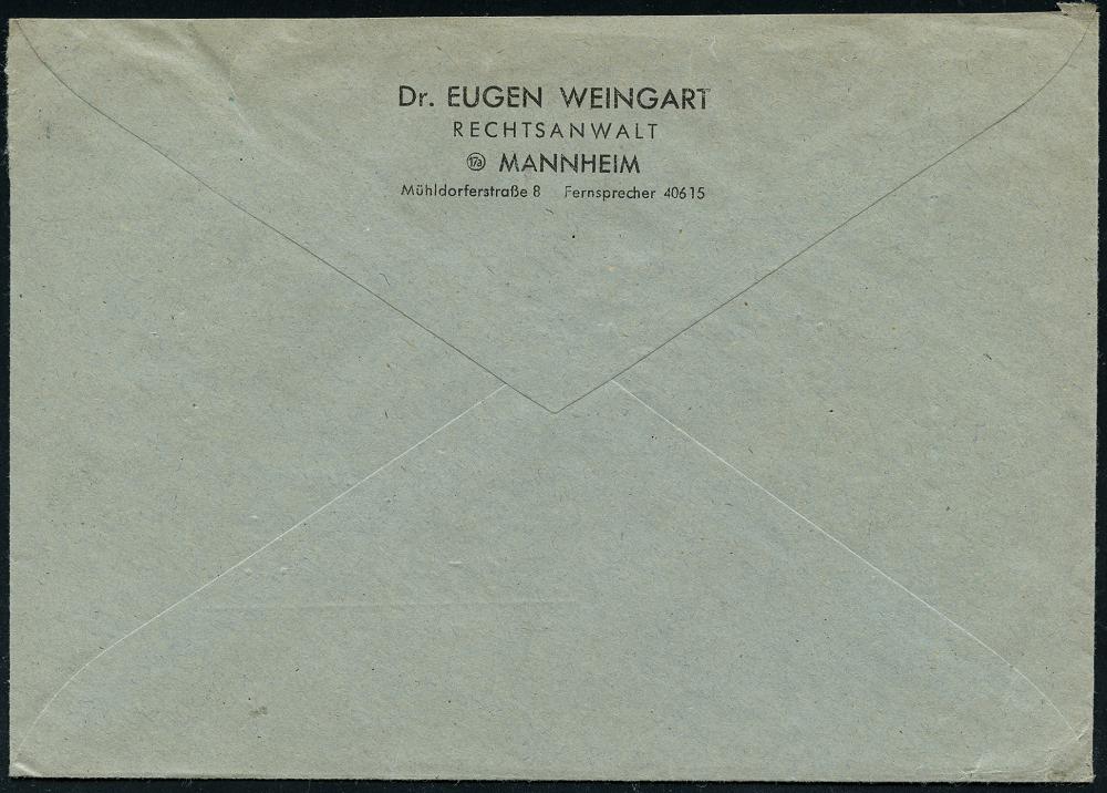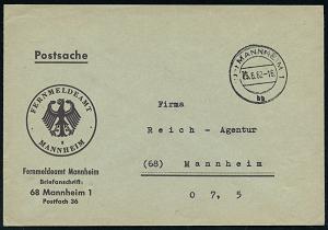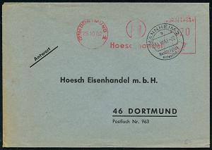2697 | 16 € | 6800 Mannheim Allgemeine Belege : MANNHEIM 2/ a/ Nachträglich/ entwertet 1962 (31.10.) 1K-Segment auf vorausfrankiertem Firmen-Antwort-Bf., AFS: (21 b) DORTMUND 1/Hoeschhandel n. Dortmund, ungewöhnliche Verwendung, der Stempel wurde sonst zur Nachstempelung ungestempelter Sendungen verwendet! | ![]() | |