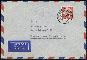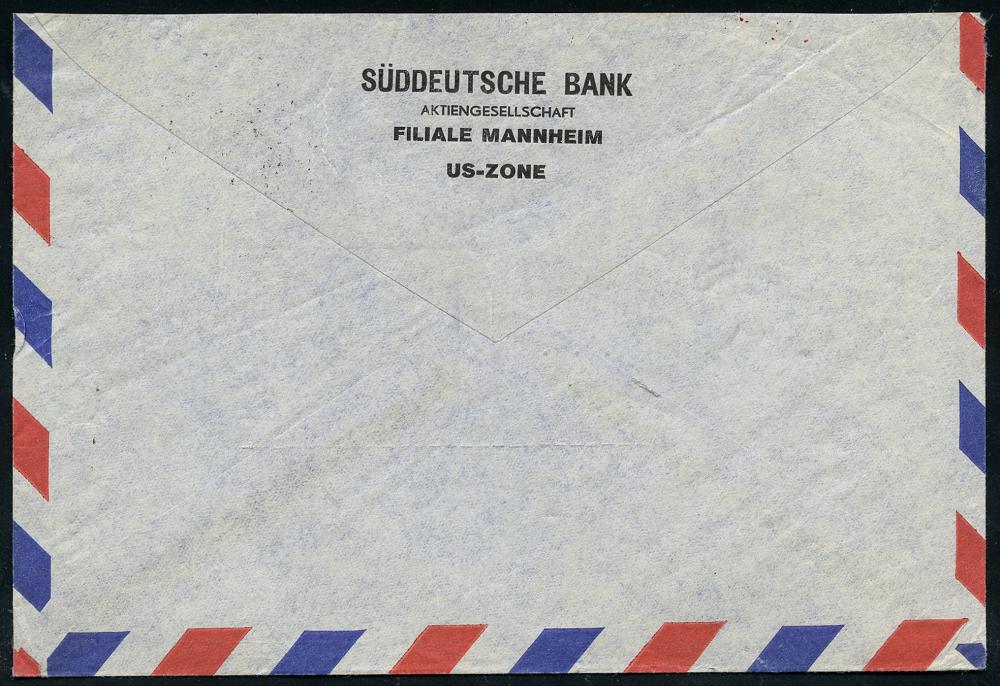 2694 | 16 € | 6800 Mannheim Allgemeine Belege : (17a) MANNHEIM 1/ g 1956 (25.1.) 2K-Steg auf EF 80 Pf. Heuss I , glasklar gest. Übersee-Flp.-Firmen-Bf.: SÜDDEUTSCHE BANK (rs. Abs.-Vordruck) nach B. Aires (Mi.192 EF, + 25.-EUR) | ![]() ![]() | |