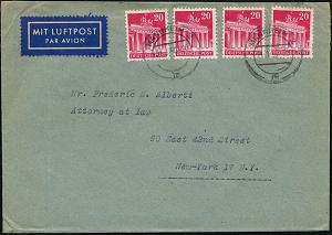 2691 | 18 € | 6800 Mannheim Allgemeine Belege : Mannheim 1950 (21.1.) 20 Pf. Bauten "Brandenbg. Tor", weit gez., reine MeF: 4 Stück (einzeln) 2x 2K-Steg: MANNHEIM 2/m, portorichtiger Übersee-Flp.-Bf. n. U.S.A. (Mi.85 wg. MeF) | ![]() ![]() | |