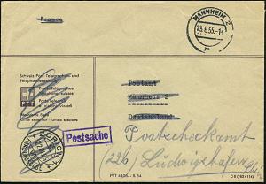 2693 | 15 € | 6800 Mannheim Allgemeine Belege : MANNHEIM 2/ m 1955 (23.6.) 2K-Steg auf schweizer Postdienstbf. PTT, 1K: ZÜRICH 1/PAKETAUSGABE (durchgestrichen) n. Mannheim, von dort weitergeleitet n. Ludwigshafen | ![]() | |