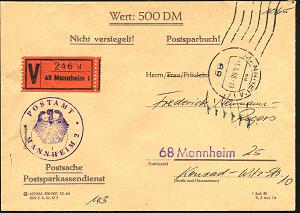 2700 | 18 € | 6800 Mannheim Allgemeine Belege : 68 MANNHEIM 1/ au 1968 (1.3.) RollWellenSt + roter V-Zettel: 68 Mannheim 1/d + viol. 1K-HdN: POSTAMT/t/MANNHEIM , portofreier Postsparkassen-Dienst-Orts-Wert-Bf. 500.- DM für Postsparbuch | ![]() | |