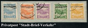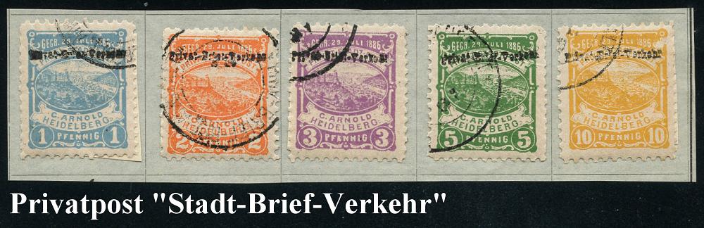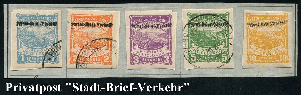 2902 | 16 € | 6900 Heidelberg Allgemeine Belege : Heidelberg 1887 "Privat-Brief-Verkehr", 1 Pf. bis 10 Pf. Heidelberger Schloß, Aufdruck-Provisorien, gezähnt (schwarz gest.) kompl. Satz (Mi.23/27 A a) | ![]() | |