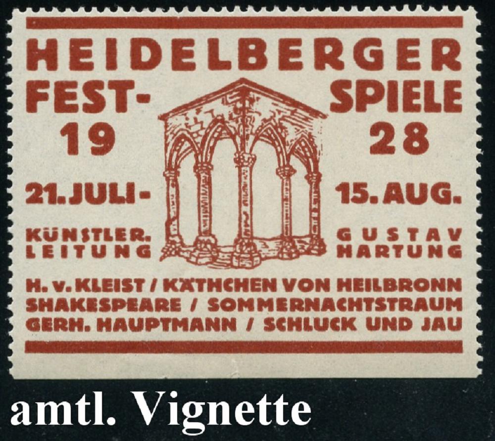 2909 | 14 € | 6900 Heidelberg Allgemeine Belege : Heidelberg 1928 Reklame-Vignette: HEIDELBERGER FESTSÜIELE 1928 mit Stücken von Kleist, Shakespeare u. G. Hauptmann , voller orig. G. | ![]() | |