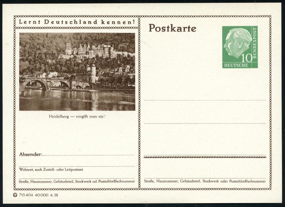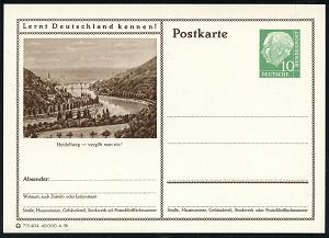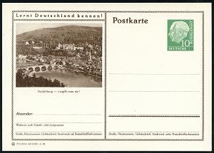 2916 | 15 € | 6900 Heidelberg Allgemeine Belege : Heidelberg 1958 10 Pf. BiP Heuss I, grün: Heidelberg - vergißt man nie!, 3 verschiedene Bilder (Schloß, Neckarbrücken) = Heidelberg kompl.! , je ungebr. (Einzelverkauf möglich: je 6.- EUR) 3 Belege (Mi.P 24/341-343) | ![]() ![]() ![]() | |