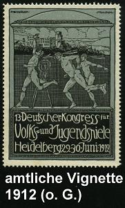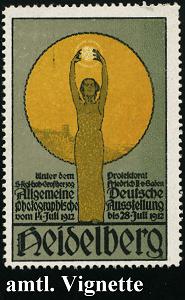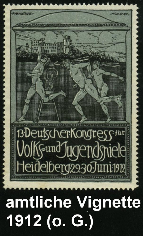 2906 | 15 € | 6900 Heidelberg Allgemeine Belege : Heidelberg 1912 (Juni) amtl. gez. Vignette: 13. Deutscher Kongress für Volks- u. Jugendspiele = nackte, antike Athleten (vor Heidelberger Schloß) o. G., selten! | ![]() | |