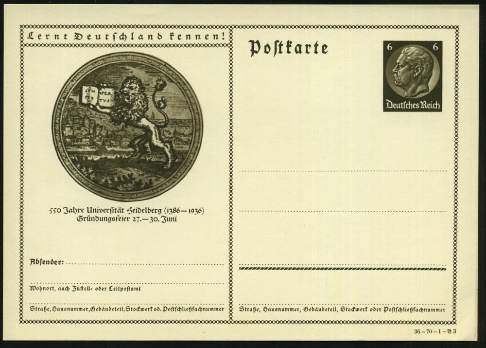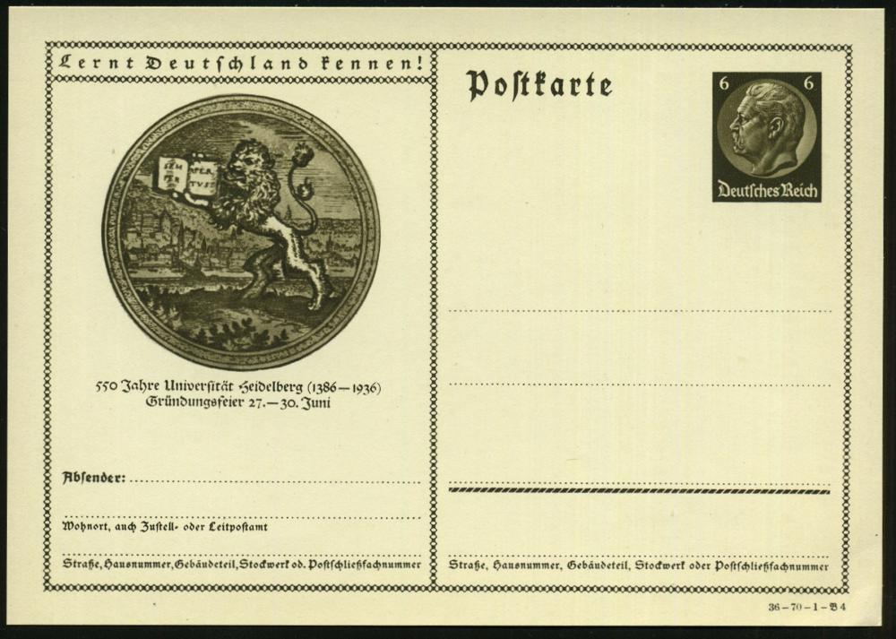 2912 | 16 € | 6900 Heidelberg Allgemeine Belege : Heidelberg 1936 6 Pf. BiP Hindenbg. braun: 550 Jahre Universität..(1386 - 1936)/Gründungsfeier (Löwe mit Buch, Schloß) 2 verschiedene Varianten, ungebr. (Einzelverkauf möglich: je 9.- EUR) 2 Belege (Mi.P 236/36-70-B3, B 4) | ![]() ![]() | |