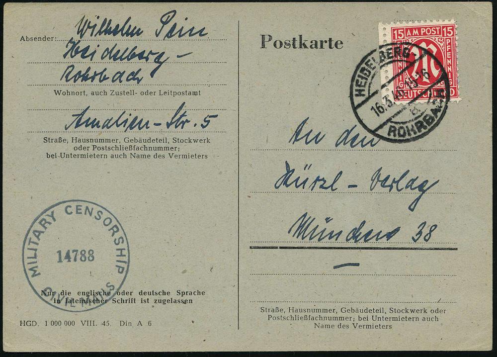 2914 | 15 € | 6900 Heidelberg Allgemeine Belege : HEIDELBERG-/ a/ ROHRBACH 1946 (16.3.) 1K-Brücke auf EF 15 Pf. AM-Post + viol. US-Zensur-1K: MILITARY CENSORSHIP/14788.. (= München, Rie. A-1b) Inl.-Zensur-Kt. n. München | ![]() | |