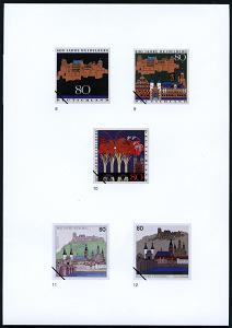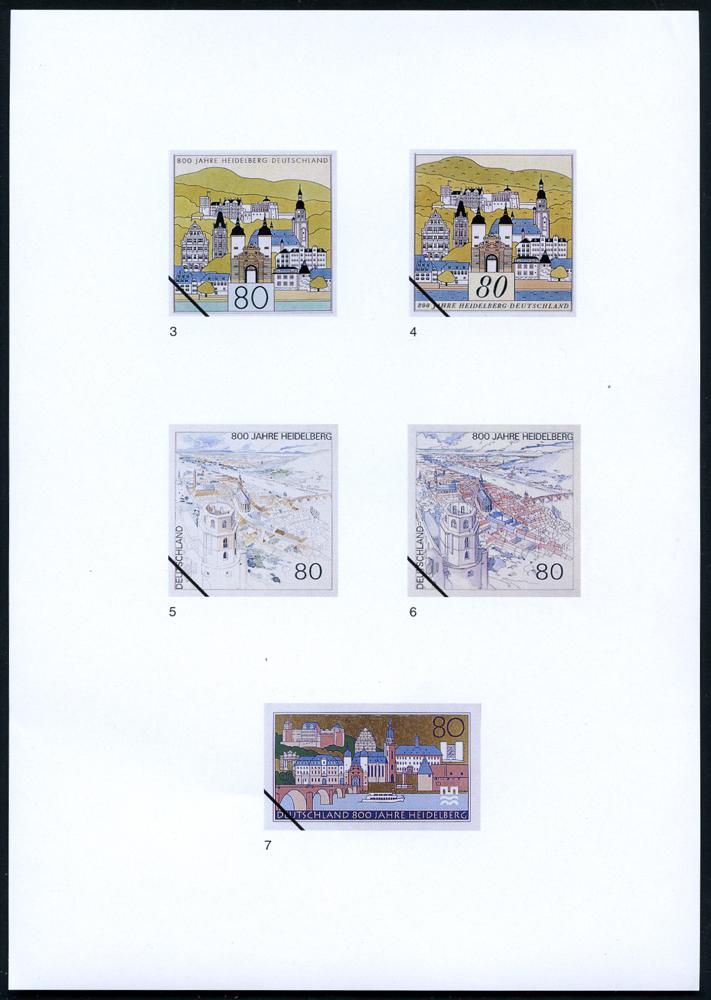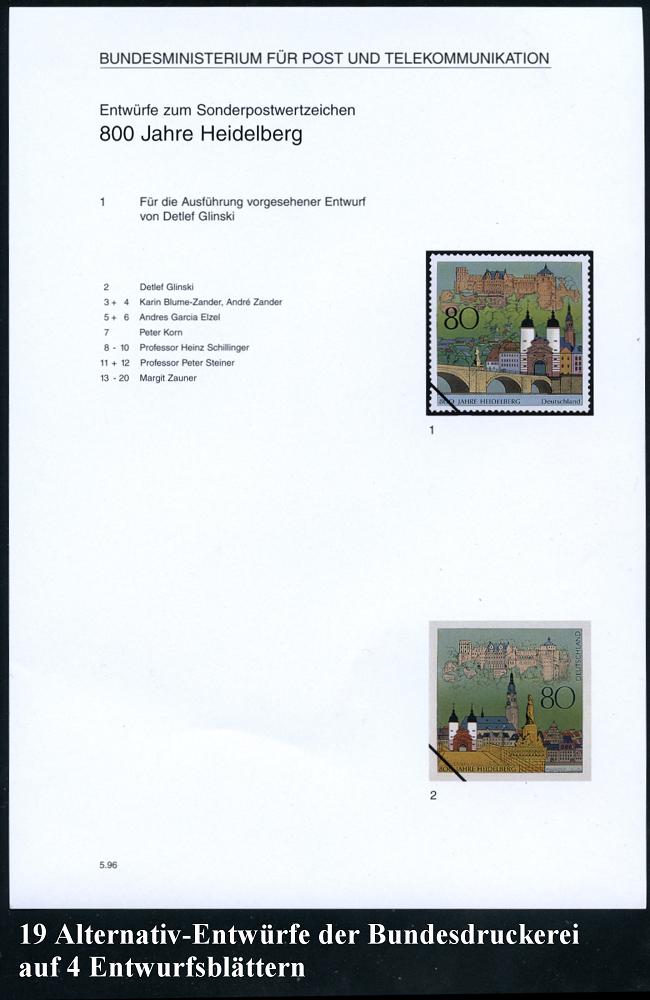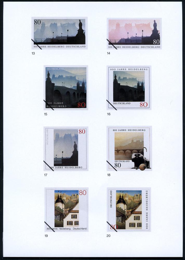 2921 | 20 € | 6900 Heidelberg Allgemeine Belege : Heidelberg 1996 80 Pf. "800 Jahre Heidelbg.", 20 verschiedene Color-Alternativ-Entwürfe der Bundesdruckerei auf 4 amtl. Entwurfsblättern, meist Brücken- u. Schloß-Motive, (1x Feuerwerk), Aufl. nur 1000 (zu Mi.1868) | ![]() ![]() ![]() ![]() | |