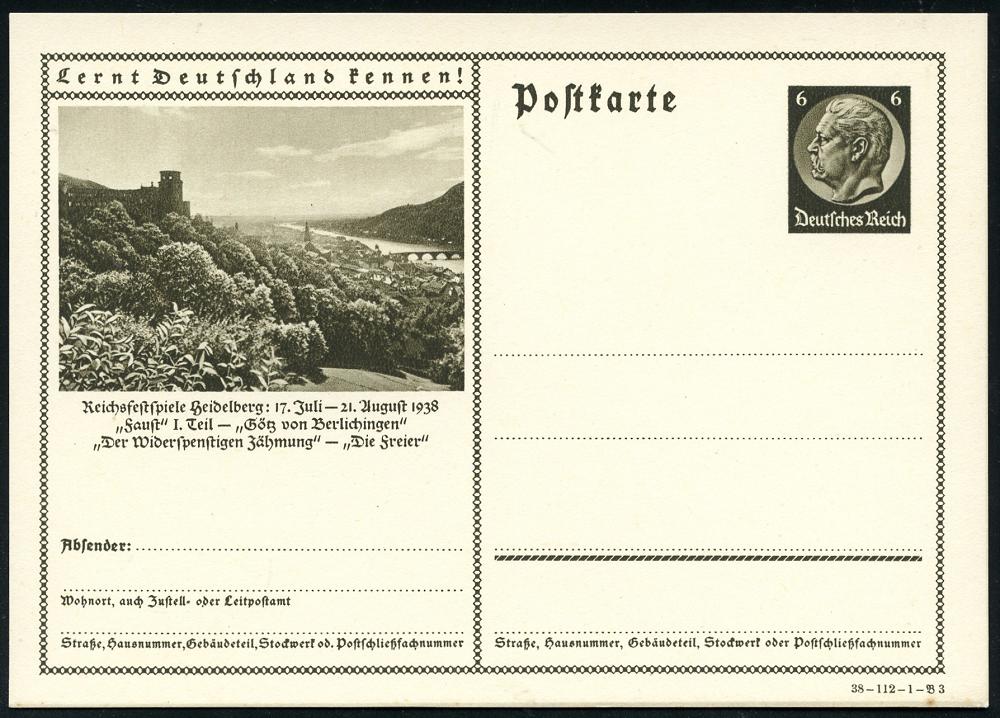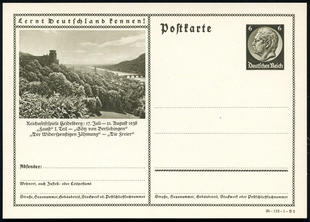 2913 | 18 € | 6900 Heidelberg Allgemeine Belege : Heidelberg 1938 6 Pf. BiP Hindenbg., braun: Reichsfestspiele.. Aug.1938 "Faust" I. Teil - "Götz v.Berlichingen", "Der Wider-spenstigen Zähmung" - "Die Freier" (Schloß etc.) 2 verschiedene Druckdaten, (Einzelverkauf möglich: je 10.- EUR) je ungebr., 2 Belege (Mi.P 236/38-112--B 2 bzw. B 3) | ![]() ![]() | |