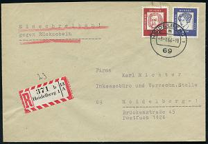 2918 | 14 € | 6900 Heidelberg Allgemeine Belege : 69 HEIDELBERG 1/ m 1964 (3.1.) 1K-Segment auf Dauerserie 20 Pf. u. 1.- DM + alter RZ: Heidelberg 1/b ohne PLZ = Aufbrauch! , klar gest. Orts-R-Bf. "Rückschein" | ![]() | |