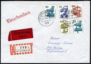 2919 | 14 € | 6900 Heidelberg Allgemeine Belege : 69 HEIDELBERG 18/ c 1974 (10.7.) 1K-Segment 2x auf satzreiner Frankatur "Unfall" + RZ: 69 Heidelberg 18/a , klar gest. Fern-R-Bf. "Eilboten", rs. AS. | ![]() | |