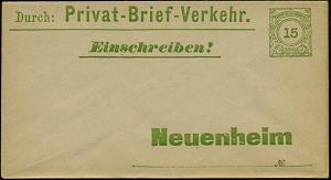2905 | 25 € | 6900 Heidelberg Allgemeine Belege : Heidelberg-Neuenheim 1890 "Privat-Brief-Verkehr" C. Arnold, 15 Pf. Ornamentrahmen, grün. Einschreiben! , ungebr., selten! | ![]() | |