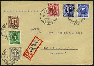 2915 | 20 € | 6900 Heidelberg Allgemeine Belege : HEIDELBERG-/ HANDSCHUHSHEIM/ a 1946 (19.7.) 1K-Brücke auf AM-Post 4 Pf., 10 Pf., 15 Pf. u. 25 Pf. u. Kontrollrat 5 Pf. u. 25 Pf. + RZ: Heidelberg-/Handschuhsheim, portorichtiger Fern-R-Bf. (Mi.28 u.a., + 25.- EUR) | ![]() | |