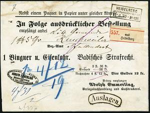 2901 | 28 € | 6900 Heidelberg Allgemeine Belege : HEIDELBERG/ STADTPOSTEXPEDITION 1872 (11.6.) Ra.3 mit Datum + roter Paketzettel: aus / Heidelberg + Wurststempel: Auslagen , dekorativer NN-Paket-Begleitbf. (dreiseitig geöffnet, gelocht): Nebst einem Paquet in Papier unter gleicher Adresse.. (Bad. Strafrecht) n. Pfullendorf | ![]() | |