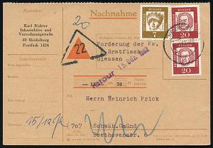2917 | 15 € | 6900 Heidelberg Allgemeine Belege : HEIDELBERG 3/ r 1962 (14.12.) aptierter 2K-Steg = alte PLGZ entfernt , 47-Pf.-Frankatur + 1L: retour , Fern-NN-Retour-Kt.: Karl Richter.. 69 Heidelberg | ![]() | |