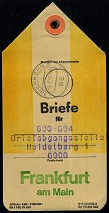 2920 | 12 € | 6900 Heidelberg Allgemeine Belege : 85 Heidelberg / Nürnberg / Frankfurt/ M. 1986 (Febr.) 1K-Segment: 85 NÜRNBERG 3/i auf Postsack-Vorbindezettel: Briefe für .. Frankfurt am Main nach Heidelberg 6900 , erstklassige Erhaltung! | ![]() | |