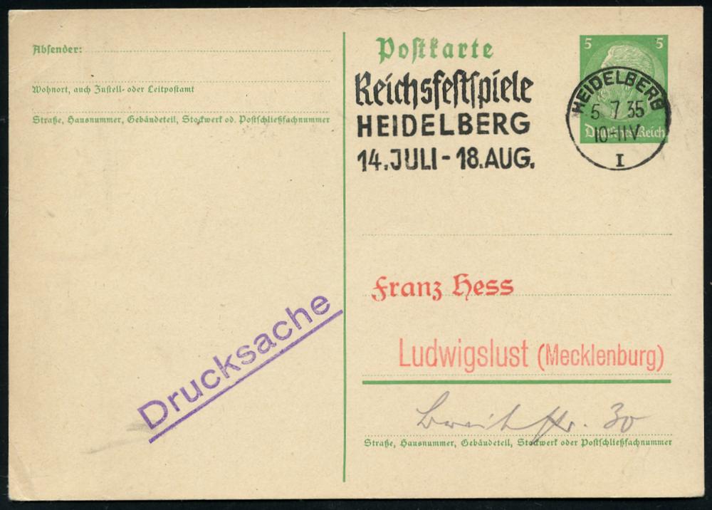 2938 | 12 € | 6900 Heidelberg Maschinen- & Serienstempel : HEIDELBERG/ I/ Reichsfestspiele/ HEIDELBERG/ 14.JULI-18.AUG. 1935 (5.7.) MWS klar auf Inl.-Karte (Bo.11 A) | ![]() | |