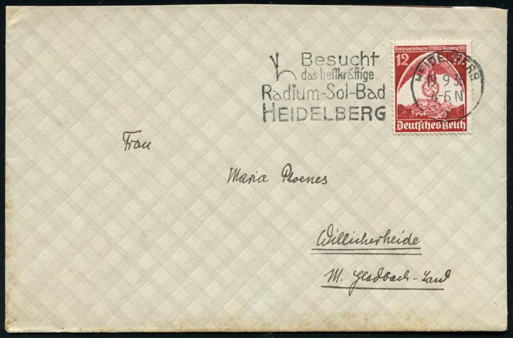 2939 | 15 € | 6900 Heidelberg Maschinen- & Serienstempel : HEIDELBERG/ I/ Besucht/ das heilkräftige/ Radium-Sol-Bad.. 1935 (19.9.) MWSt klar auf Bedarfs-Bf. , EF 12 Pf. NSDAP-Parteitag (Bo.8 A I = UZ röm. I, Erstjahr!) | ![]() | |