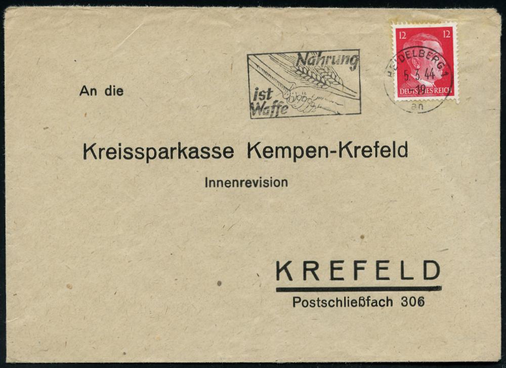 2952 | 16 € | 6900 Heidelberg Maschinen- & Serienstempel : HEIDELBERG 1/ an/ Nahrung/ ist/ Waffe 1944 (5.3.) seltener MWSt (Hand mit german. Schwert, 2 Ähren) auf Firmen-Bf. (gefaltet, da Antwort-Bf.) n. Krefeld (Bo.S 407 A, nur ca. 1 Jahr verwendet) | ![]() | |