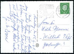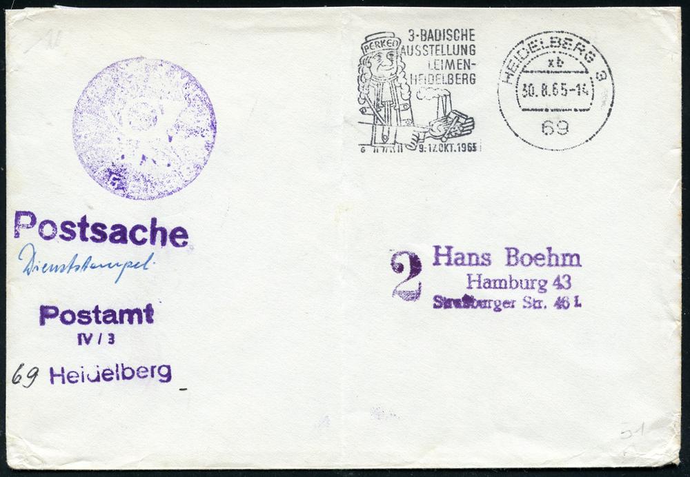 2967 | 12 € | 6900 Heidelberg Maschinen- & Serienstempel : 69 HEIDELBERG 3/ xb/ 3.BADISCHE/ AUSSTELLUNG/ LEIMEN-/ HEIDELBERG 1965 (30.8.) MWSt + viol. 3L: Postamt/ IV-3/Heidelberg (hs. "69" ergänzt) + 1L. Postsache + viol. Negativ-Dienstsiegel-HdN (gefalteter) Postdienst-Antwort-Bf. (Bo.51 A) | ![]() | |