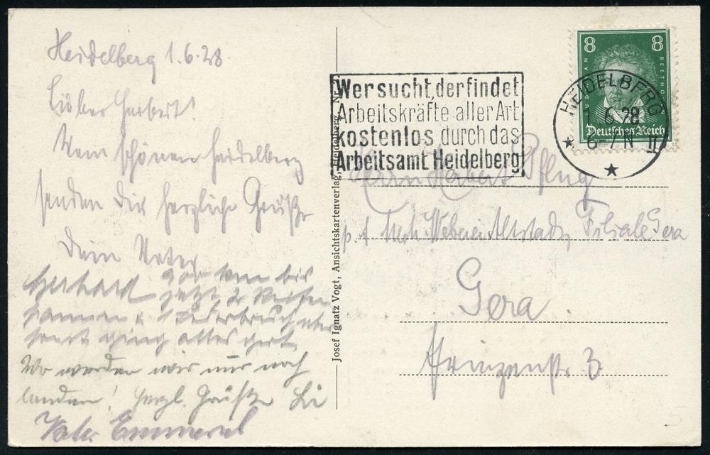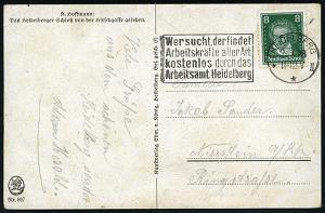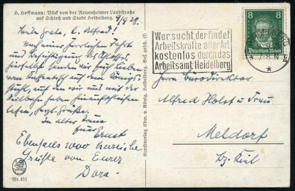 2933 | 15 € | 6900 Heidelberg Maschinen- & Serienstempel : HEIDELBERG/ **II/ Wer sucht,der findet/ Arbeitskräfte aller Art.. 1928 (9.9.) MWSt mit Bibel-Zitat auf Künstler-Color-Ak.: Blick von der Neuenheimer Landstr. auf das Schloß, Bedarf (Bo.5 A I , nur 1928 verwendet) | ![]() ![]() | |