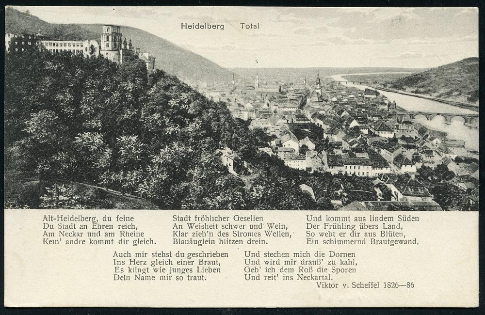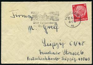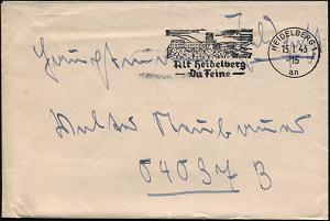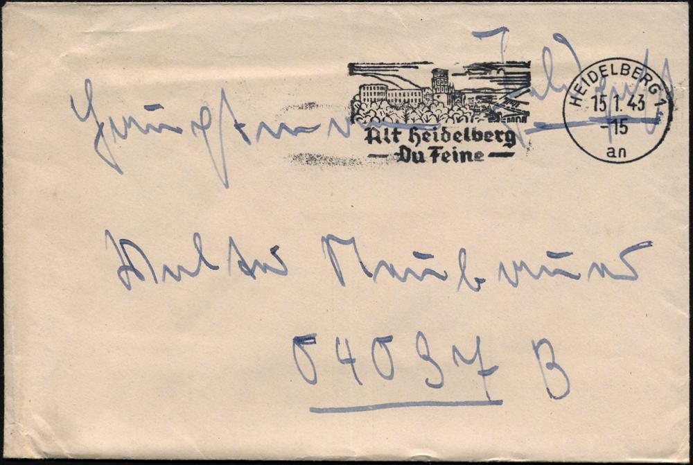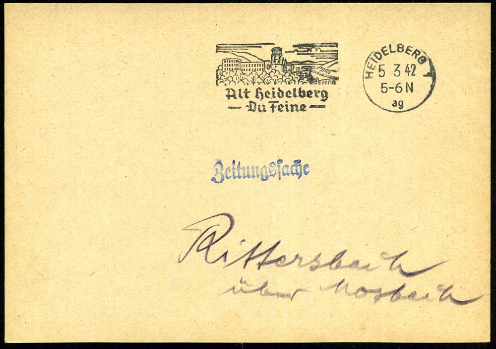 2947 | 12 € | 6900 Heidelberg Maschinen- & Serienstempel : HEIDELBERG 1/ ag/ Alt Heidelberg/ Du Feine 1942 (12.5.) MWSt = Liedtext von Schumann! (Schloß) klar gest., kleiner a. Bedarfs-Bf. (bo.16 A III) | ![]() | |